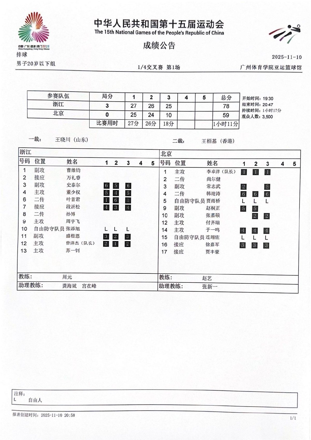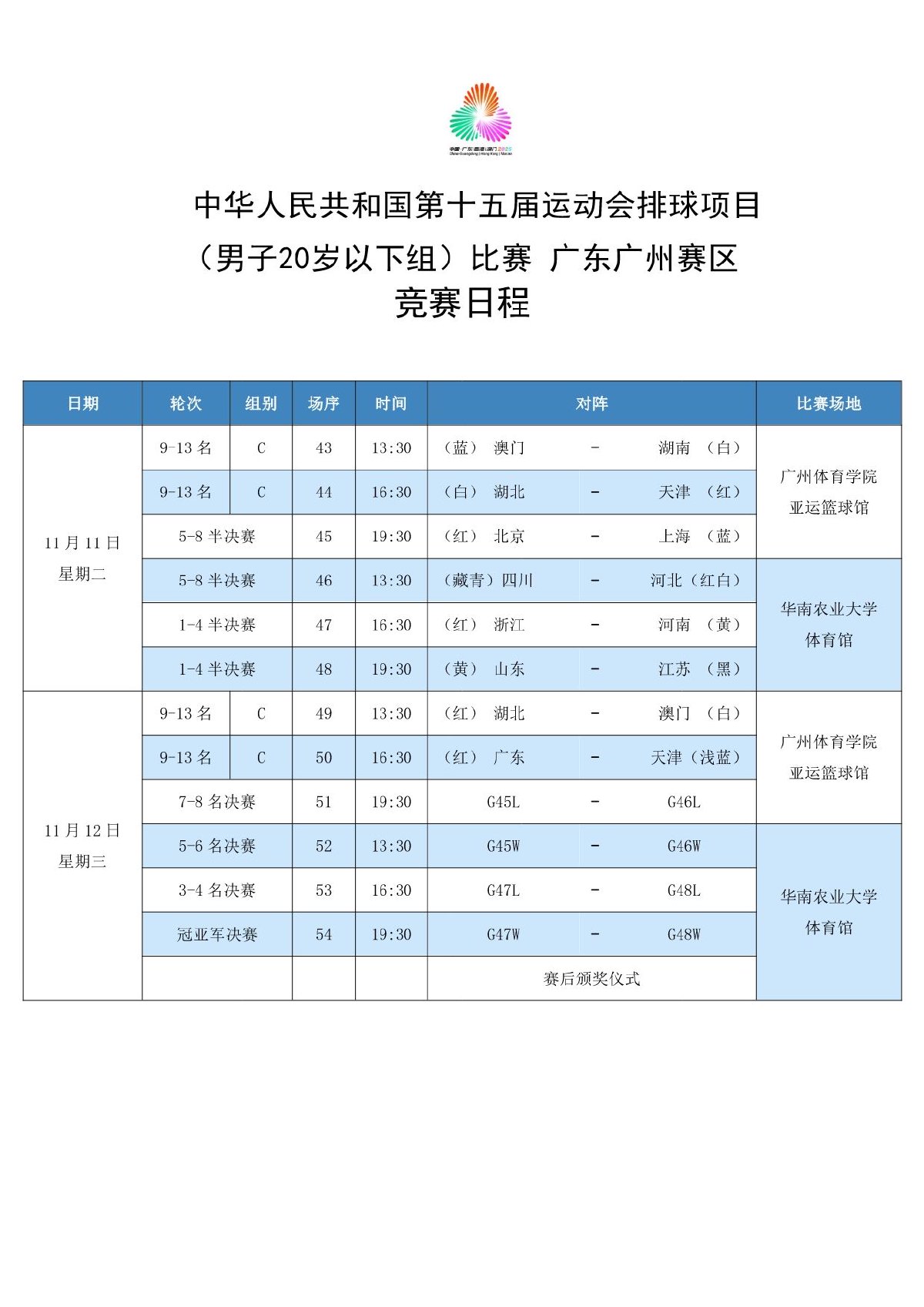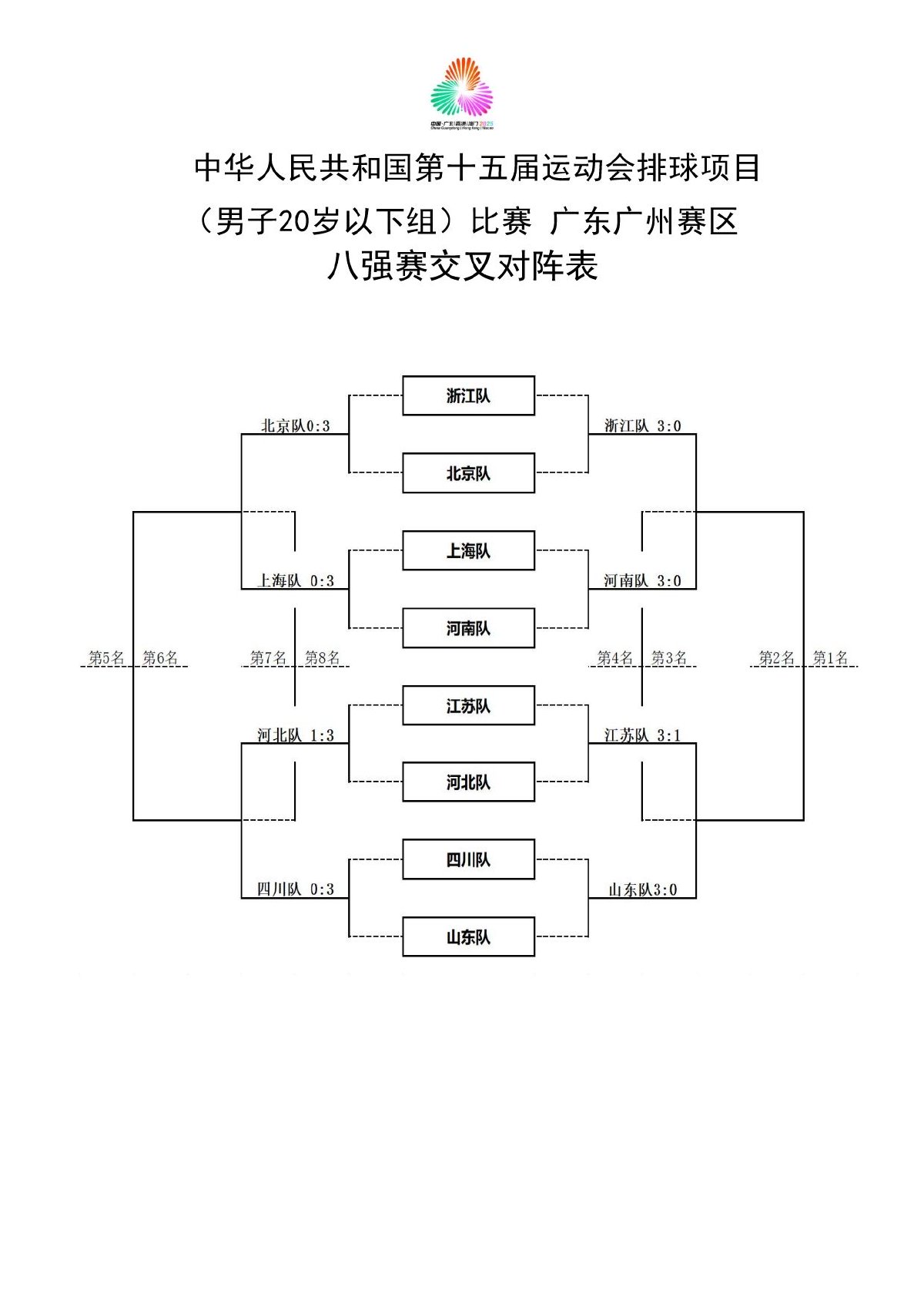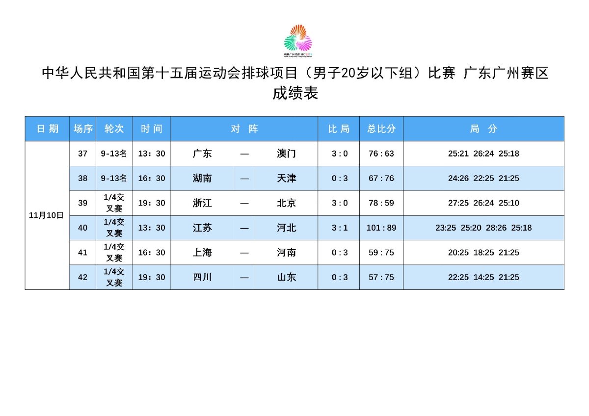 第十五届全国运动会排球项目(男子20岁以下组)比赛9号公告