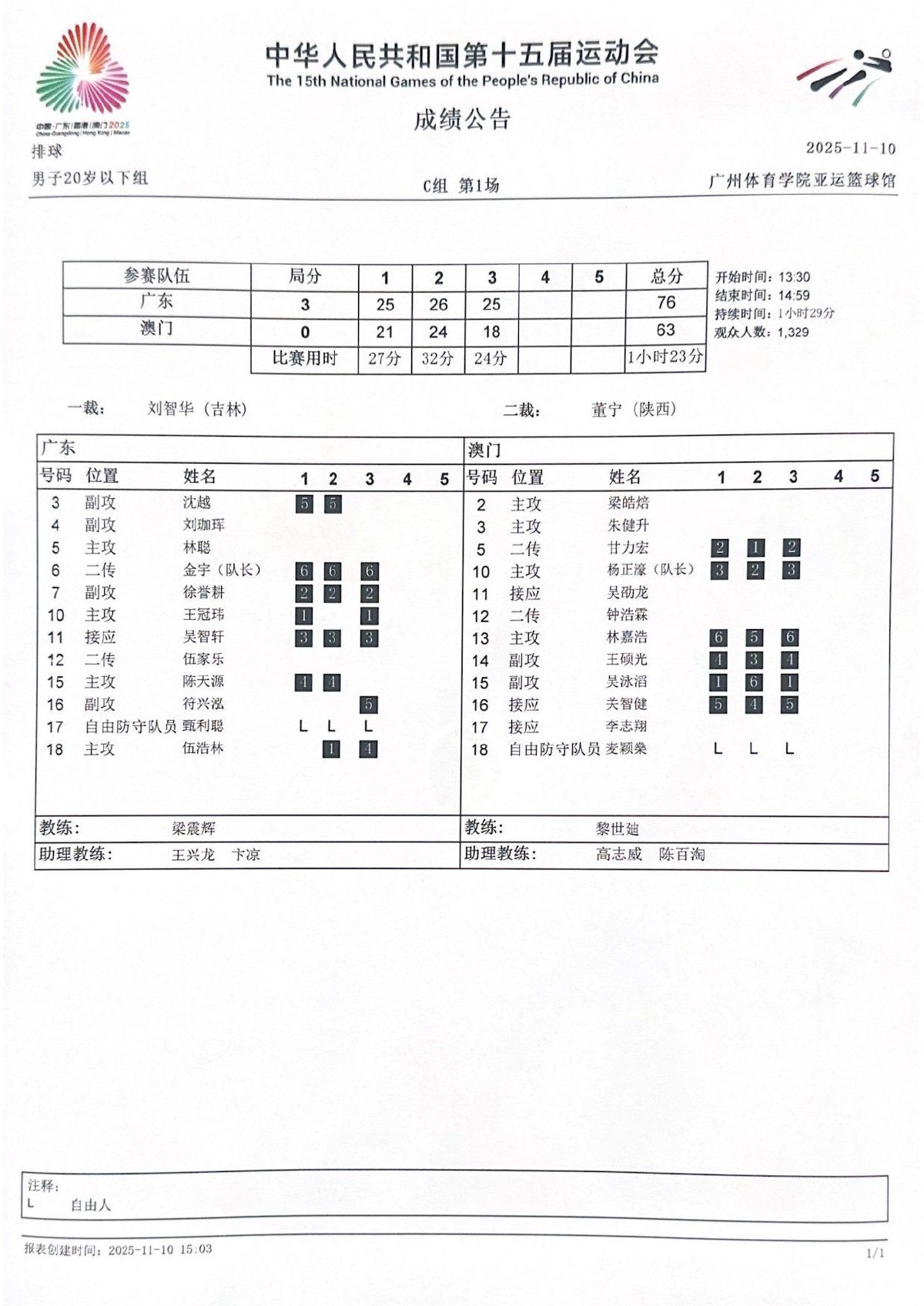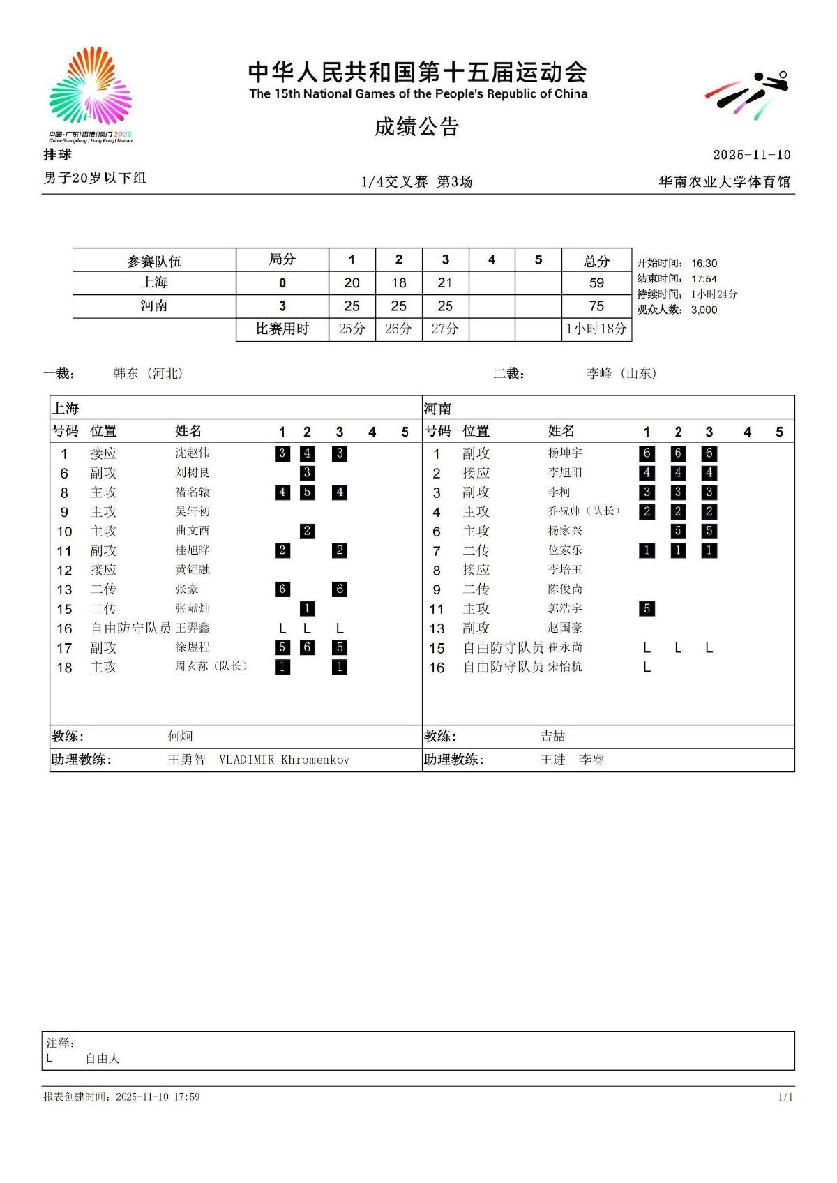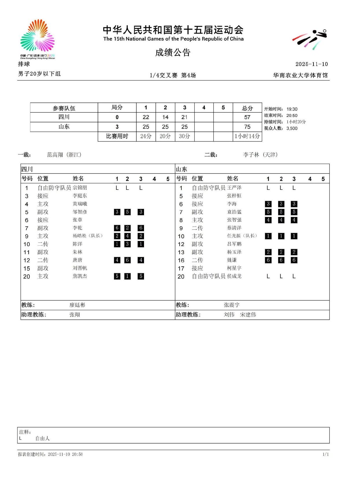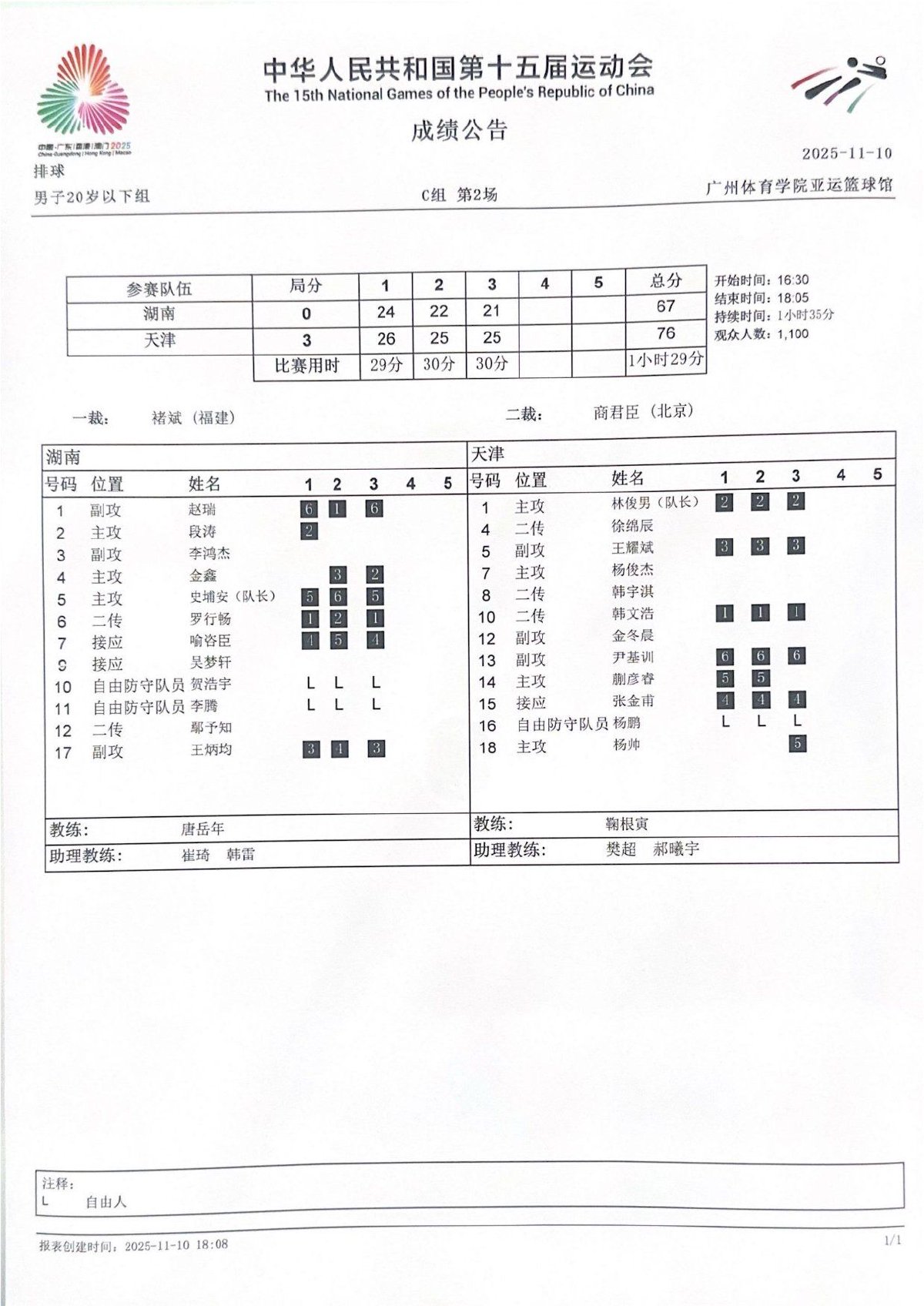 第十五届全国运动会排球项目(男子20岁以下组)比赛9号公告