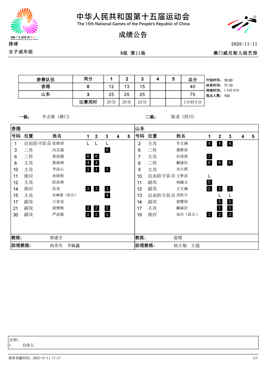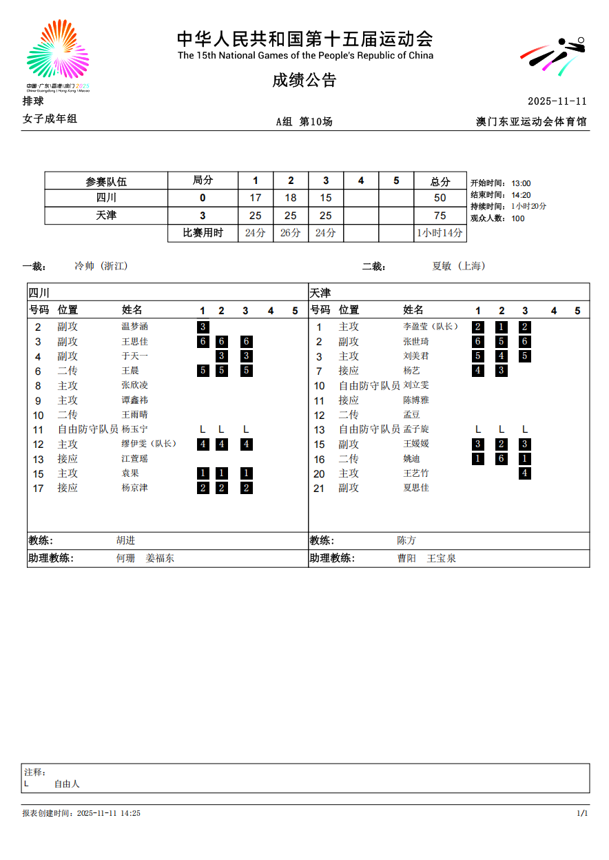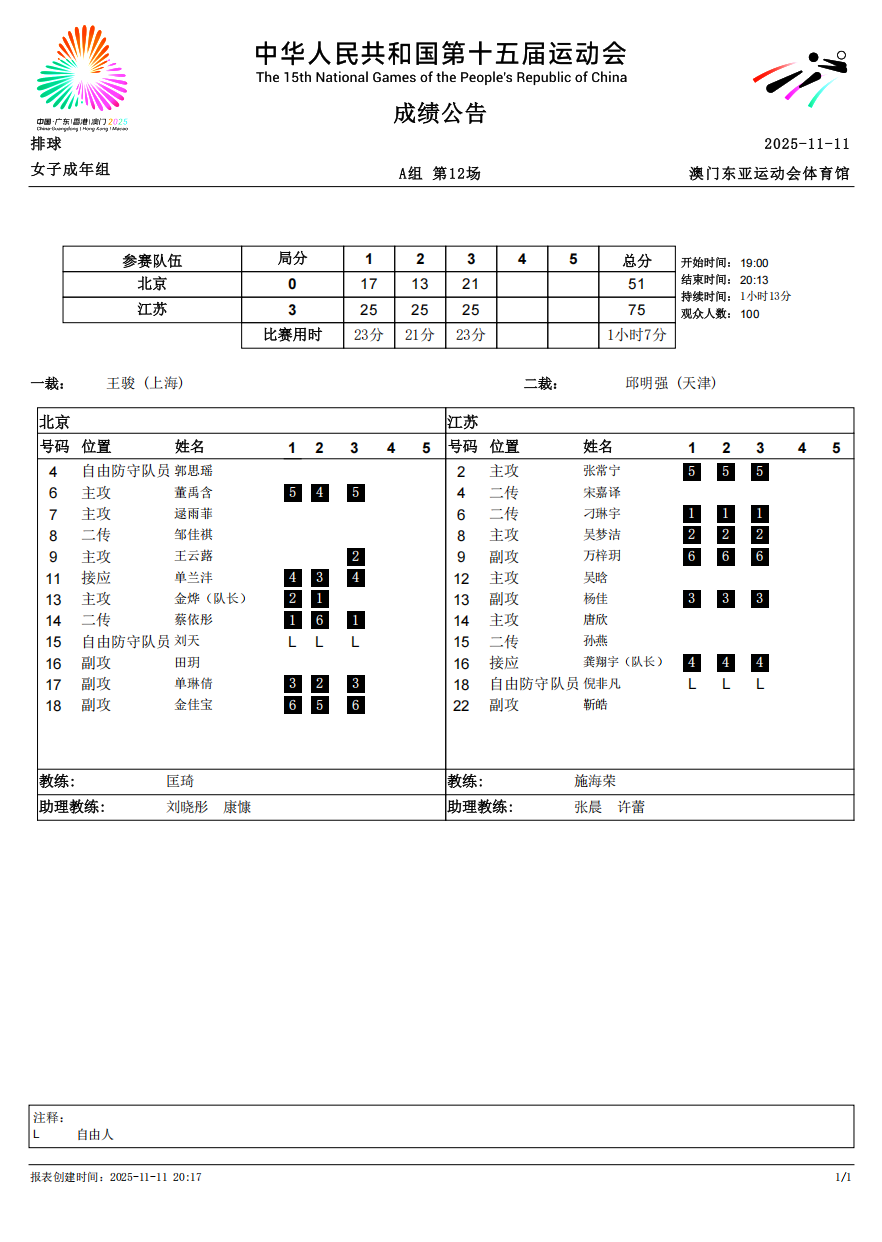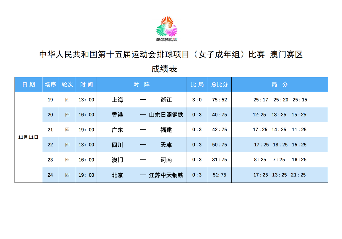 第十五届全国运动会排球项目(女子成年组)比赛5号公告