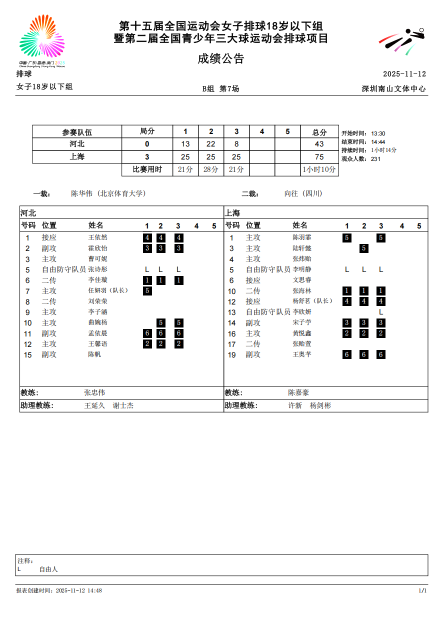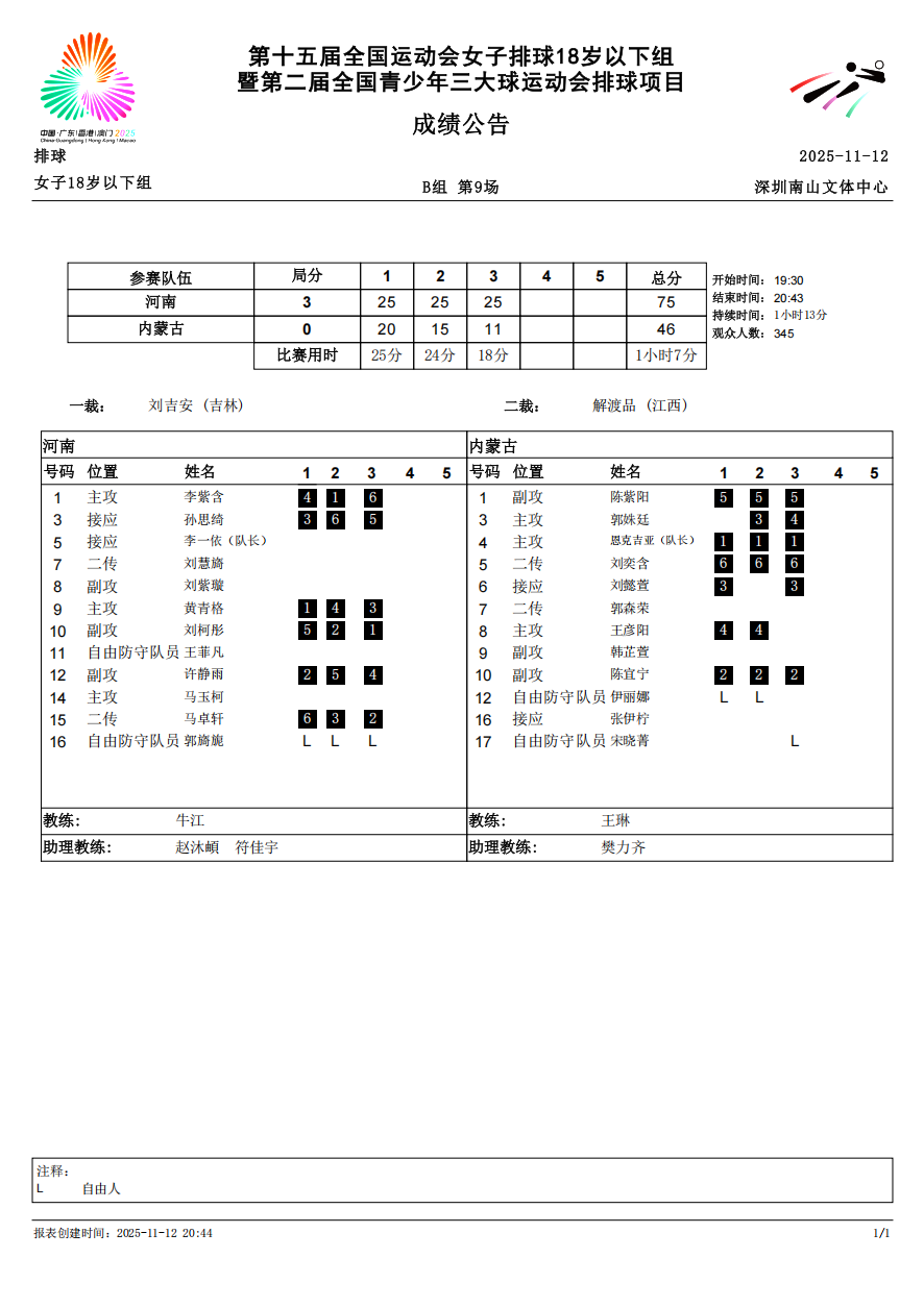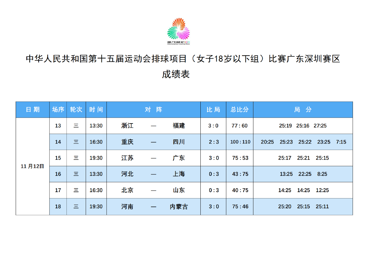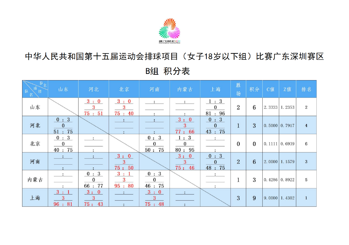 第十五届全国运动会排球项目(女子18岁以下组)比赛4号公告