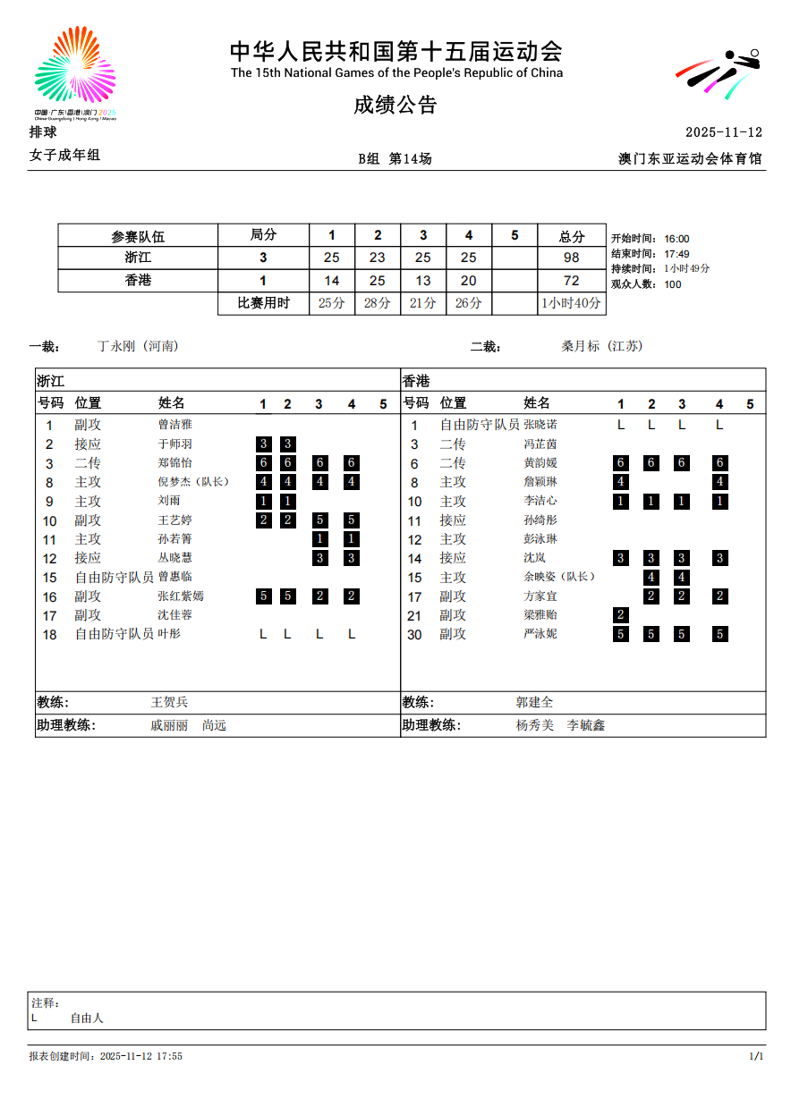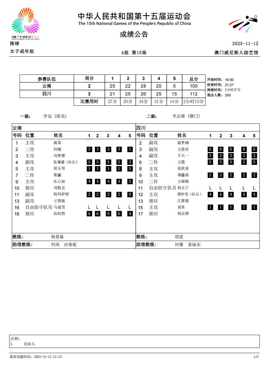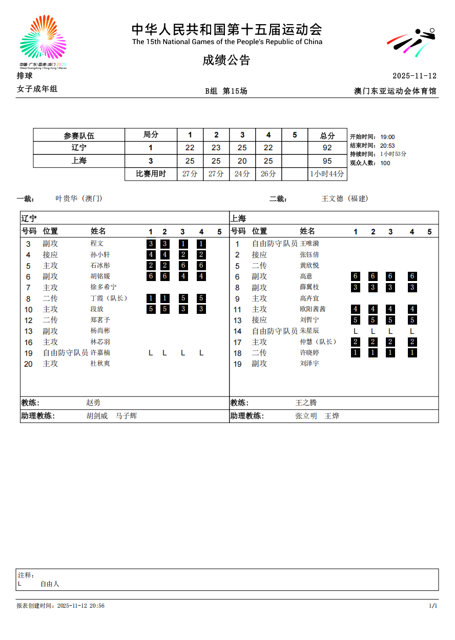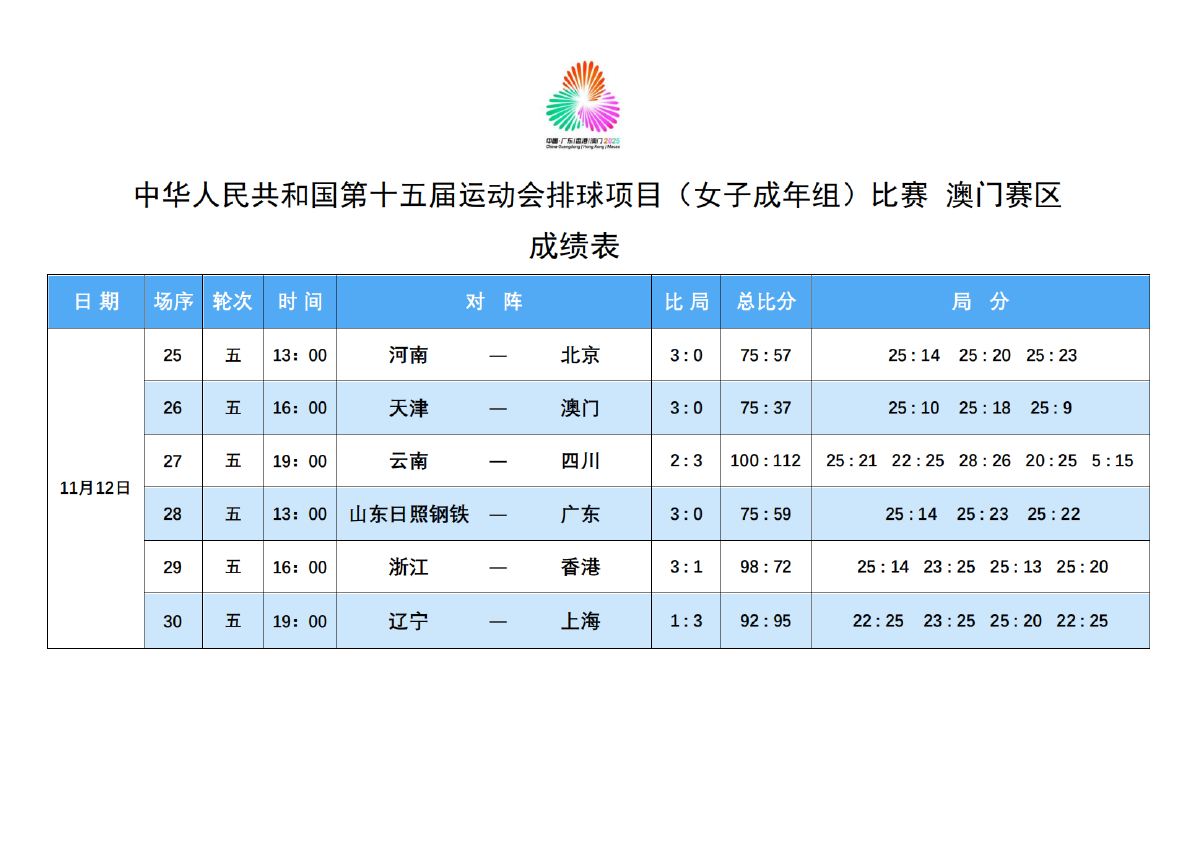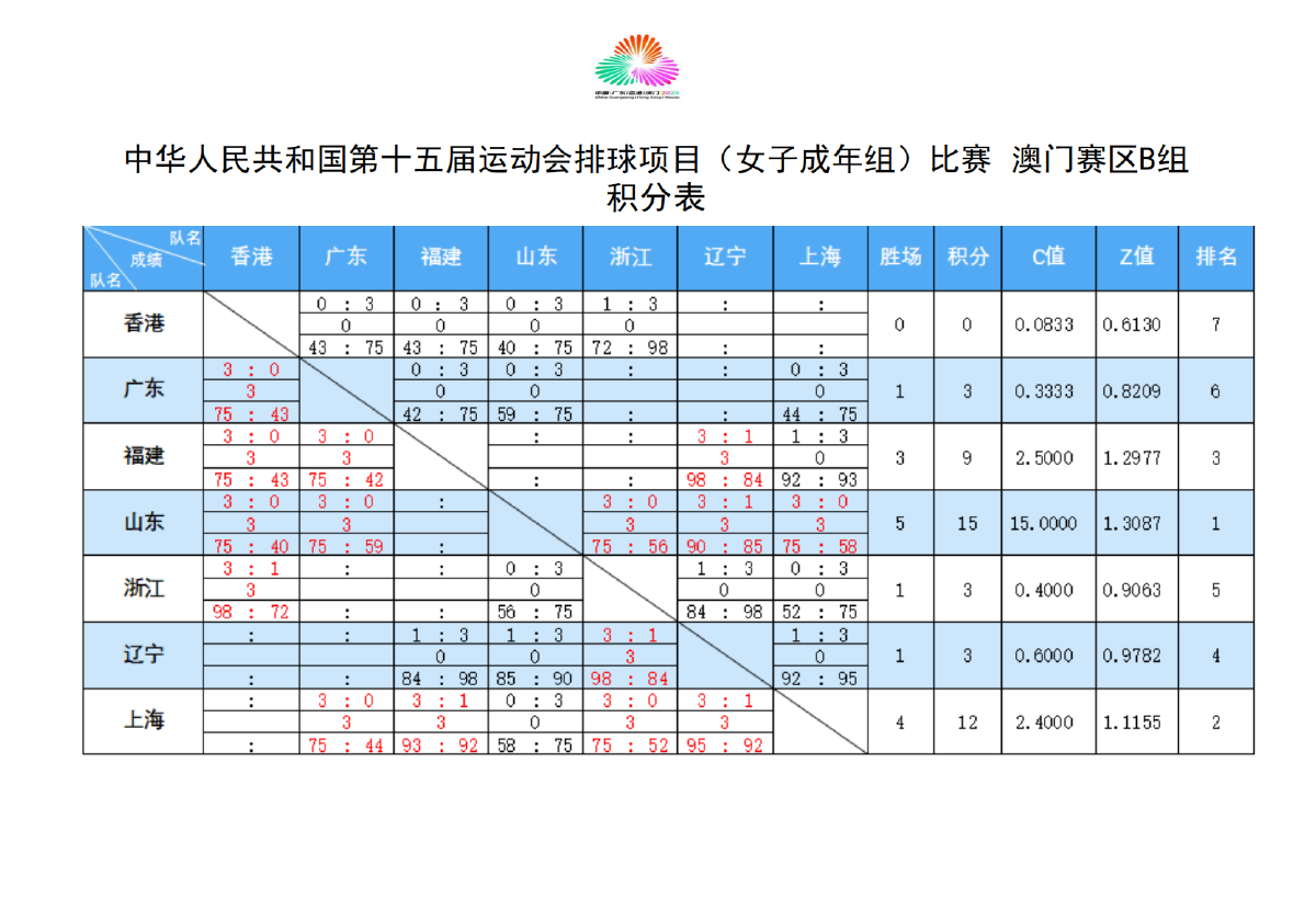 第十五届全国运动会排球项目(女子成年组)比赛6号公告