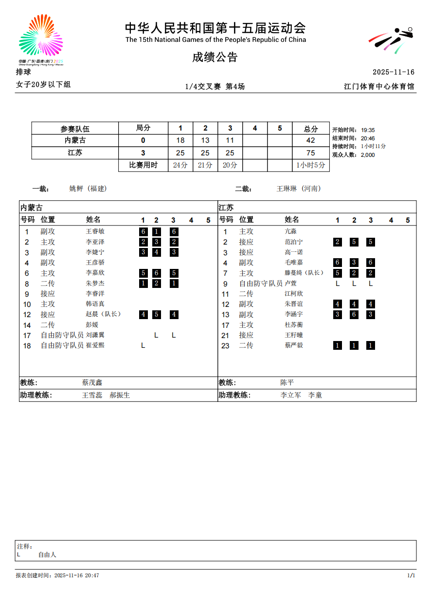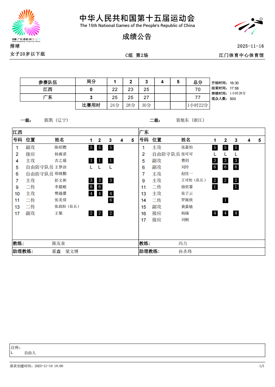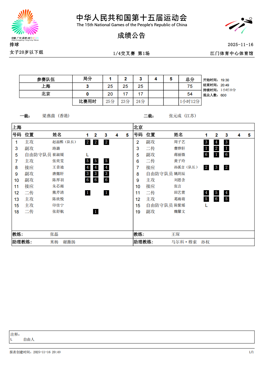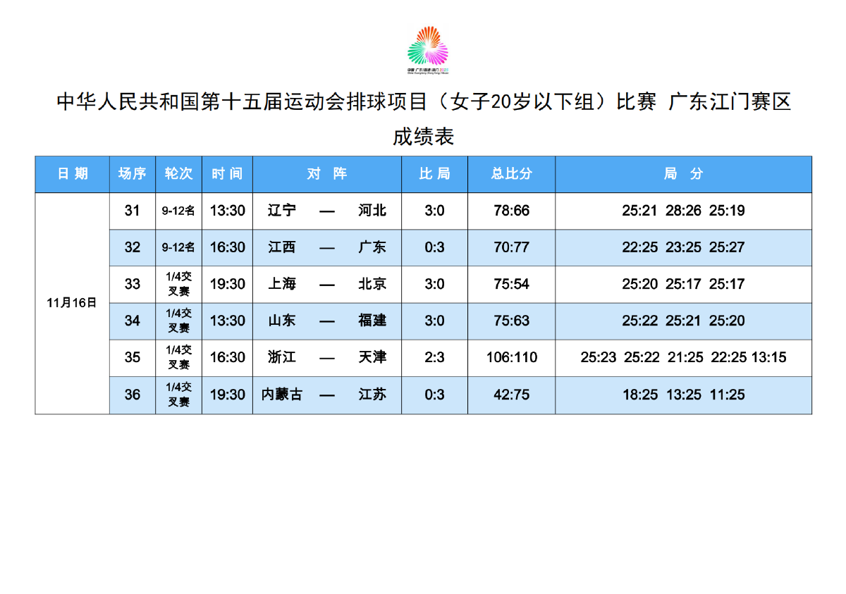 第十五届全国运动会排球项目(女子20岁以下组)比赛7号公告