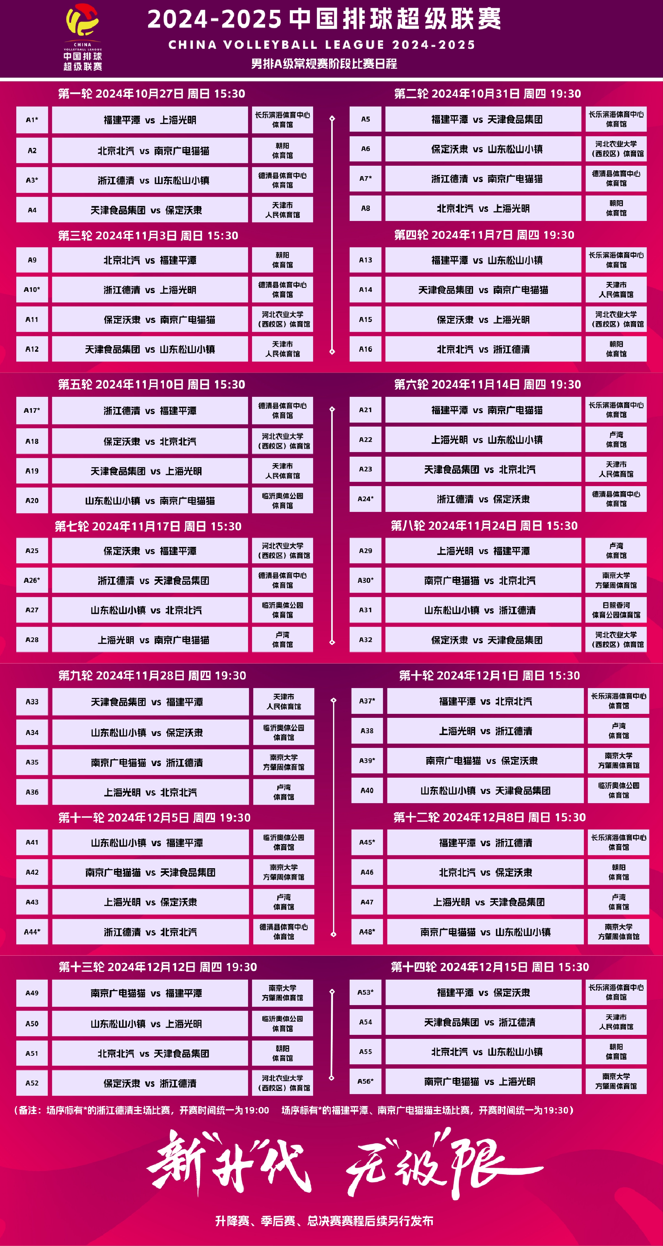 2024-2025中国男子排球超级联赛A级常规赛赛程